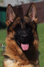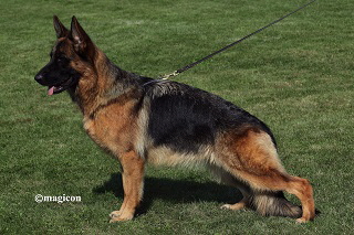 Mittelgroß, mittelkräftig. Gut geformter Kopf, korrekte Winkelungen und Verhältnisse, gerade Front. Kraftvolle, raumschaffende Gänge. Sehr typvoll, sehr ausdrucksvolle Gesamterscheinung. TSB ausgeprägt.