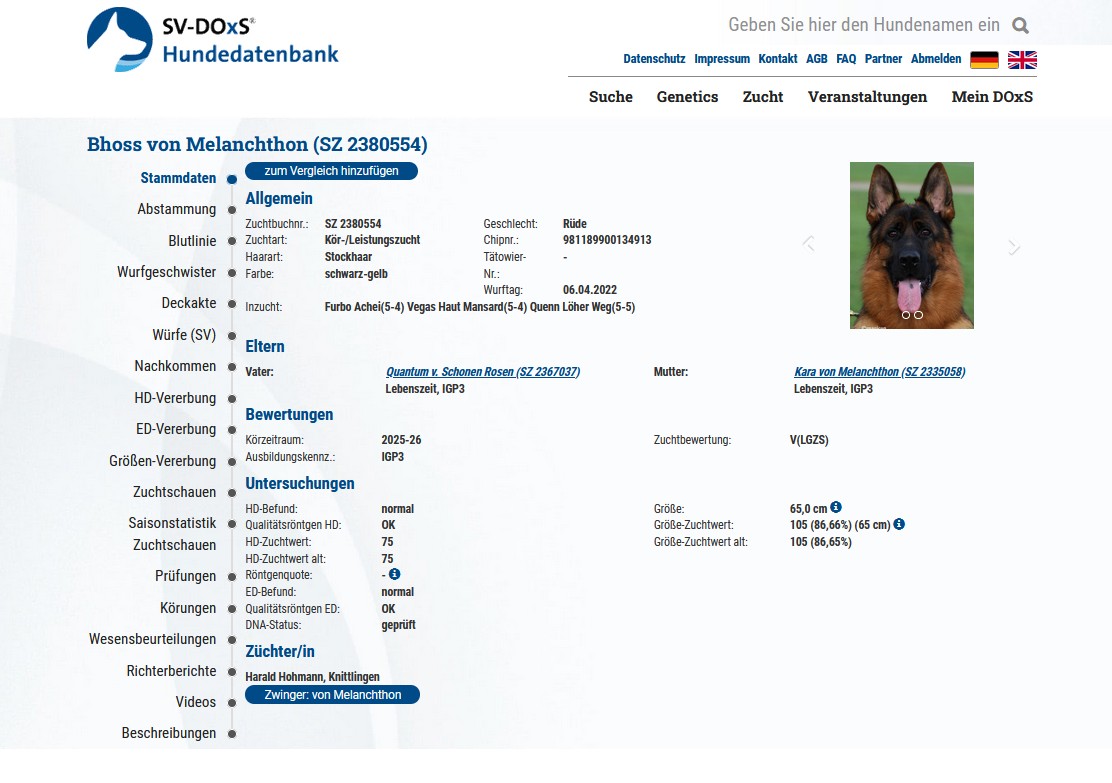 Excerpt from breed survey report: Special advantages Harmonious male dog with correct conformation. Advice for breeding use Suitable for improving conformation and angulation. |