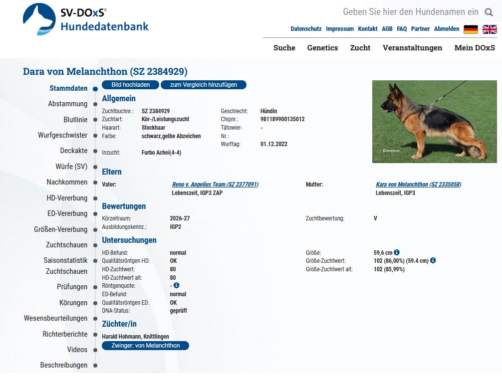 Körung am 08.03.2025 in Donaueschingen bestanden. Auszug Körbericht: Groß,mittelkräftig gehaltvoll, sehr adlige Gesamterscheinung. Die Hündin ist in korrekten Gebäudeverhältnissen aufgebaut, trocken und fest und sehr gut pigmentiert. Sehr ausdrucksvoller, kräftiger Kopf mit korrekt getragenen Ohren, hoher Widerrist, fester, gerader Rücken, sehr gute Länge und Lage der Kruppe. Sehr gute Winkelungen der Vor- und Hinterhand, ausgeglichene Brustverhältnisse und gerade Front. Vorne gerade-, hinten minimal eng tretend zeigt die Hündin sehr raumschaffende, weit ausgreifende, flach über dem Boden gehende Gänge beit sehr guter Erhabenheit. TSB ausgeprägt. Besondere Vorzüge Sehr harmonisch aufgebaute, adelige Gesamterscheinung mit sehr guten Winkelungen. |