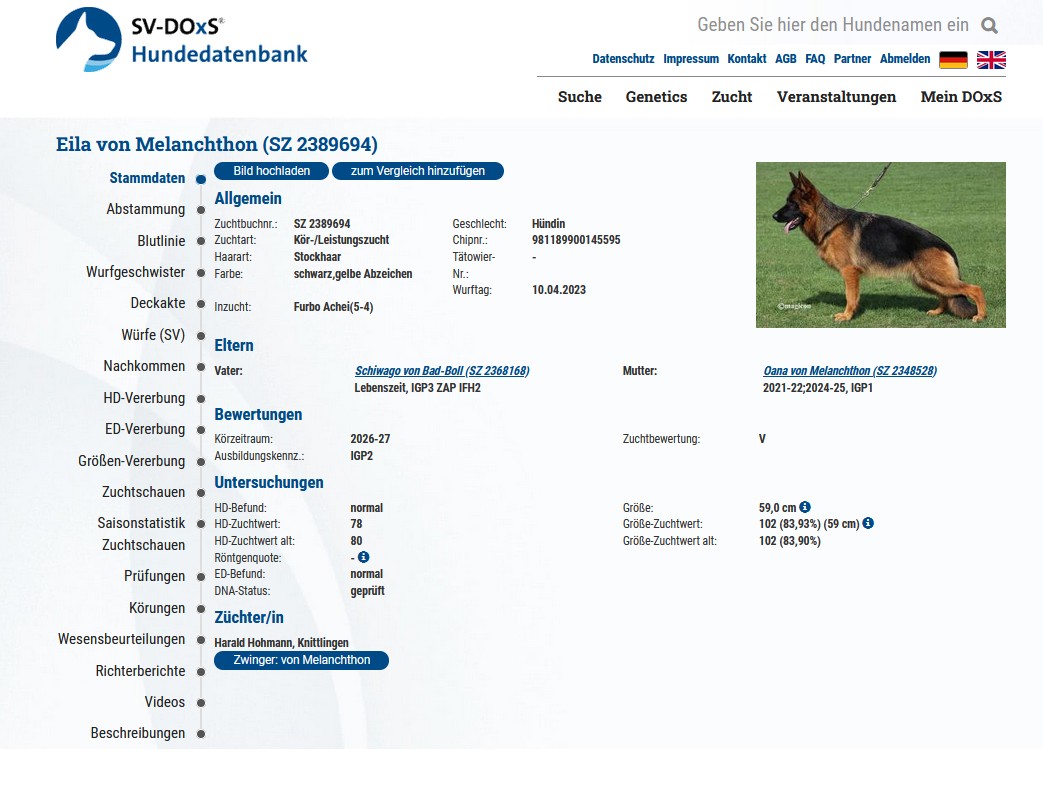 Körung am 08.03.2025 in Donaueschingen bestanden. Auszug Körbericht: Übermittelgroß, mittelkräftig, gehaltvoll, sehr gut pigmentiert, leicht gestreckt. Ausdrucksvoller femininer Kopf mit dunkler Maske und korrekt getragenen Ohren. Hoher Widerrist, fester, gerader Rücken, die gut gelagerte Kruppe müsste etwas länger sein. Korrekte Winkelungen der Vor- und Hinterhand, ausgeglichene Brustverhältnisse, gerade Front. Vorne und hinten gerade tretend zeigt die Hündin raumschaffende, kraftvolle Gänge. |